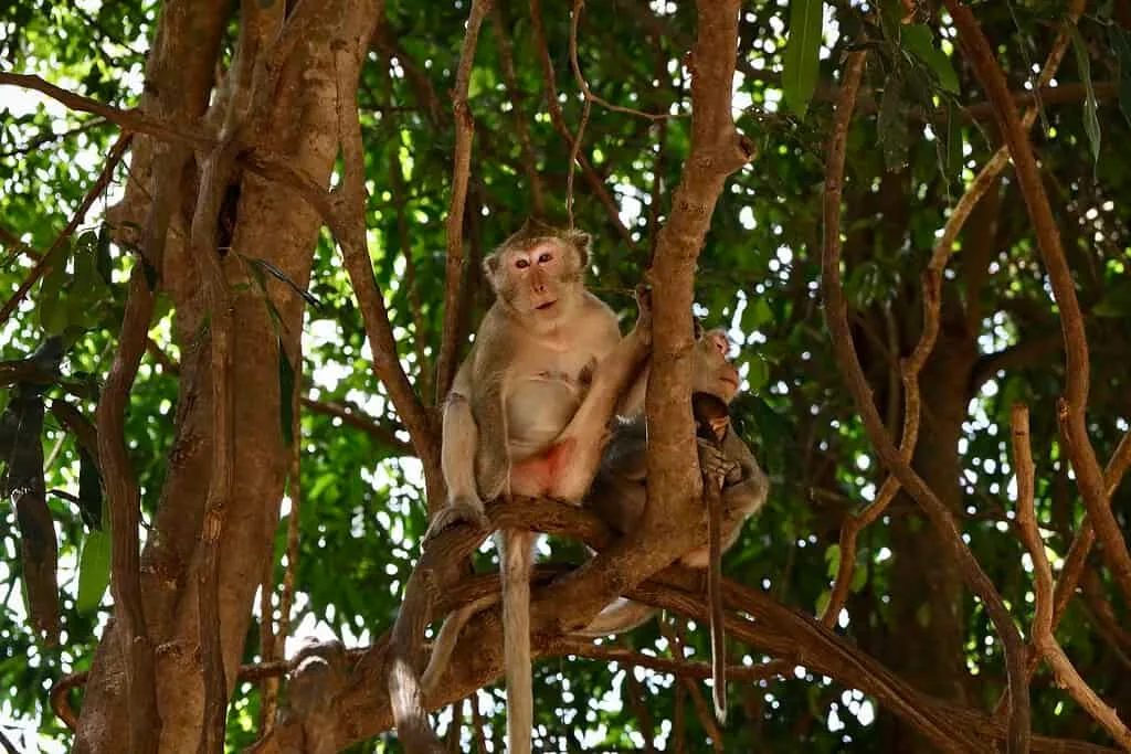 Familias cuidándose entre sí. Paseo con cautela para no molestar ni alborotar. Llama mi atención un puente, o mas bien una pasarela, que cruzo junto con dos macacos que cruzan también por los cables tensores.